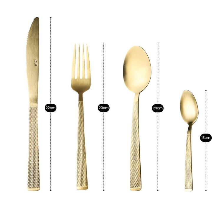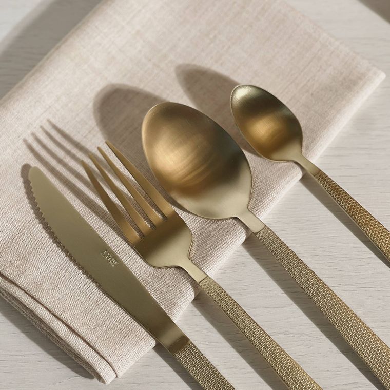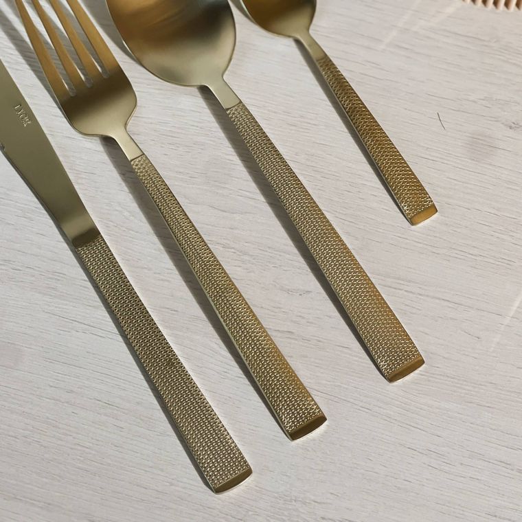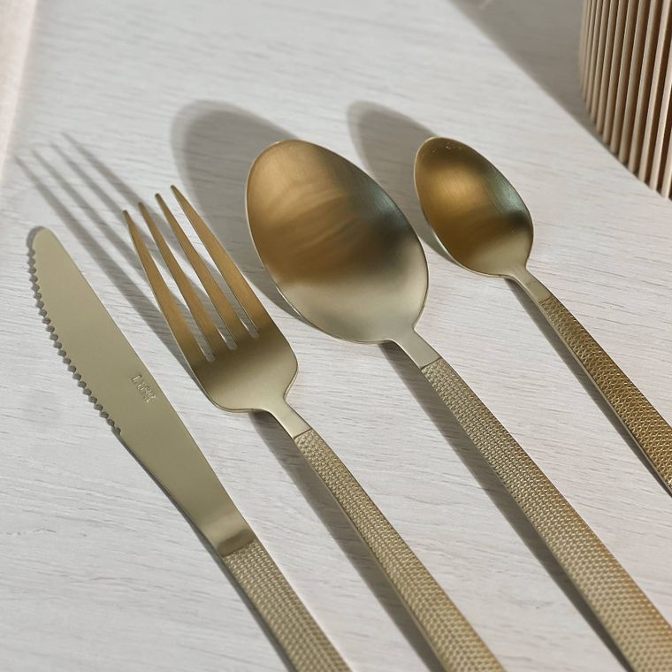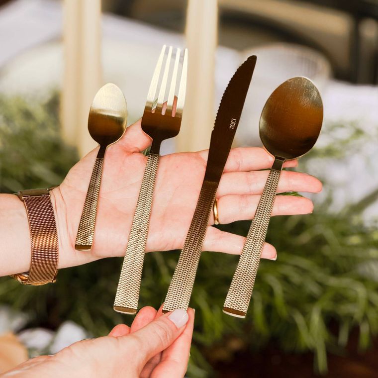 Conheça o nosso Faqueiro de Aço Inox Santorini, com acabamento na cor champanhe, trazendo elegância e modernidade para a mesa posta. As peças possuem cabos texturizados que oferecem charme extra e um toque sofisticado ao conjunto. Ideal para compor mesas especiais, jantares refinados ou elevar o dia a dia com estilo. Resistentes, duráveis e com design contemporâneo, são perfeitas para quem valoriza beleza e qualidade em cada detalhe.