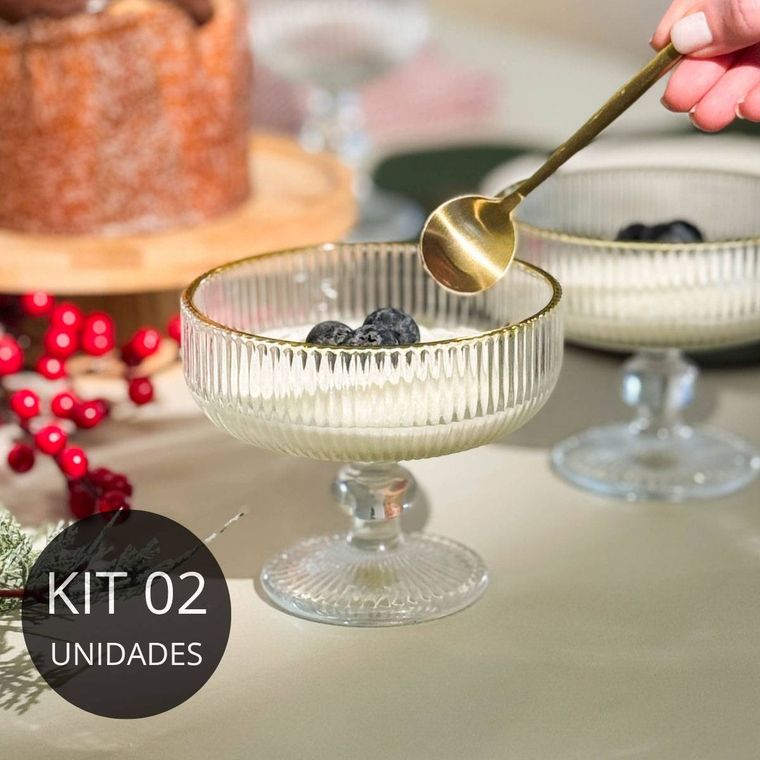 - Contém - 2 Taças de Vidro para Sobremesa Lines Fio de Ouro 320ml
