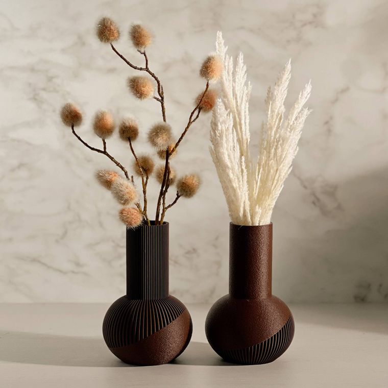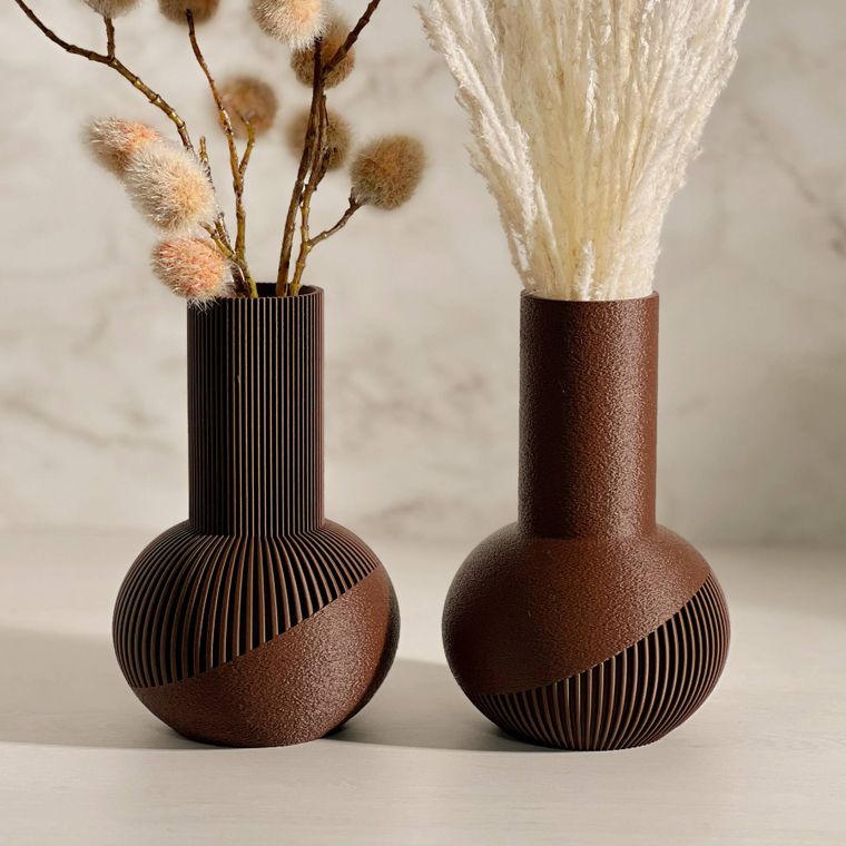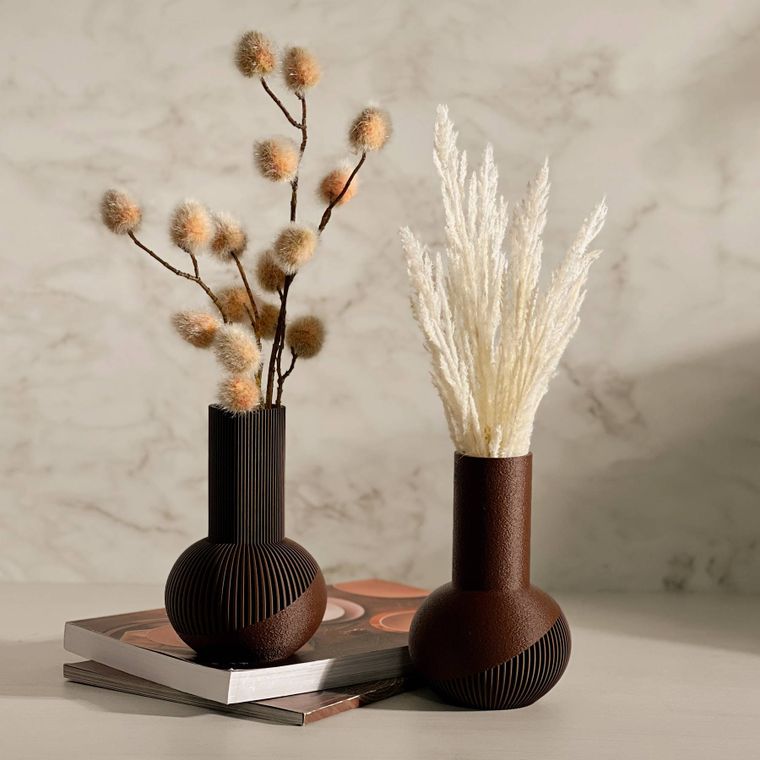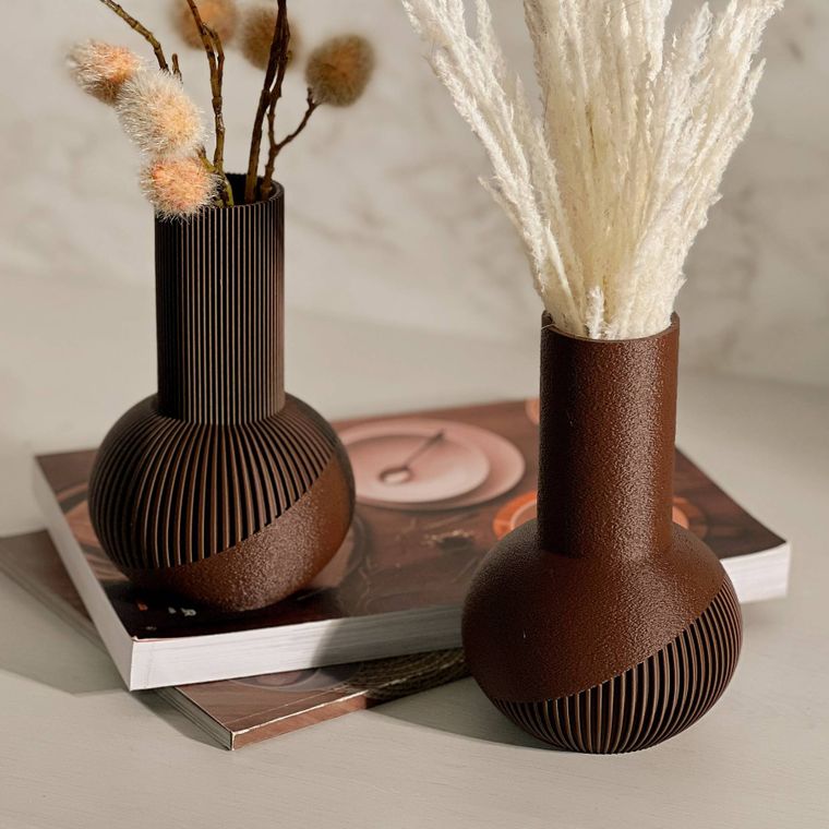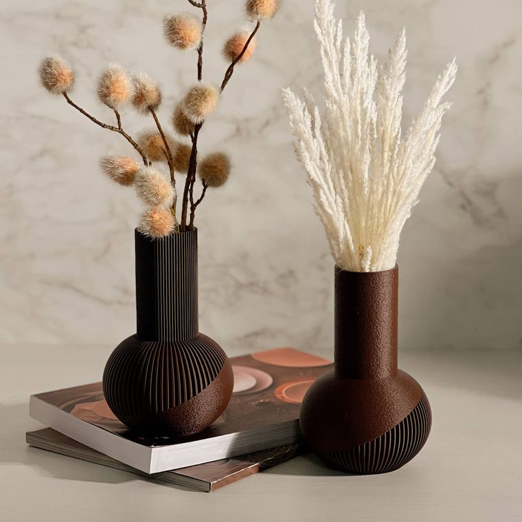 Se encante com a beleza desses vasos! Cada peça apresenta um design contemporâneo que combina o corpo esférico com pescoço cilíndrico, criando uma silhueta sofisticada e equilibrada. A textura dupla, que se complementa, adiciona profundidade, movimento e um toque artístico que se destaca em decoração minimalista, moderna, boho entre muitas outras. Produzido em PLA, um material ecológico derivado de fontes renováveis, ele combina leveza. Ideal para compor ambientes com elegância — seja com flores secas, artificiais ou como peça decorativa solo.