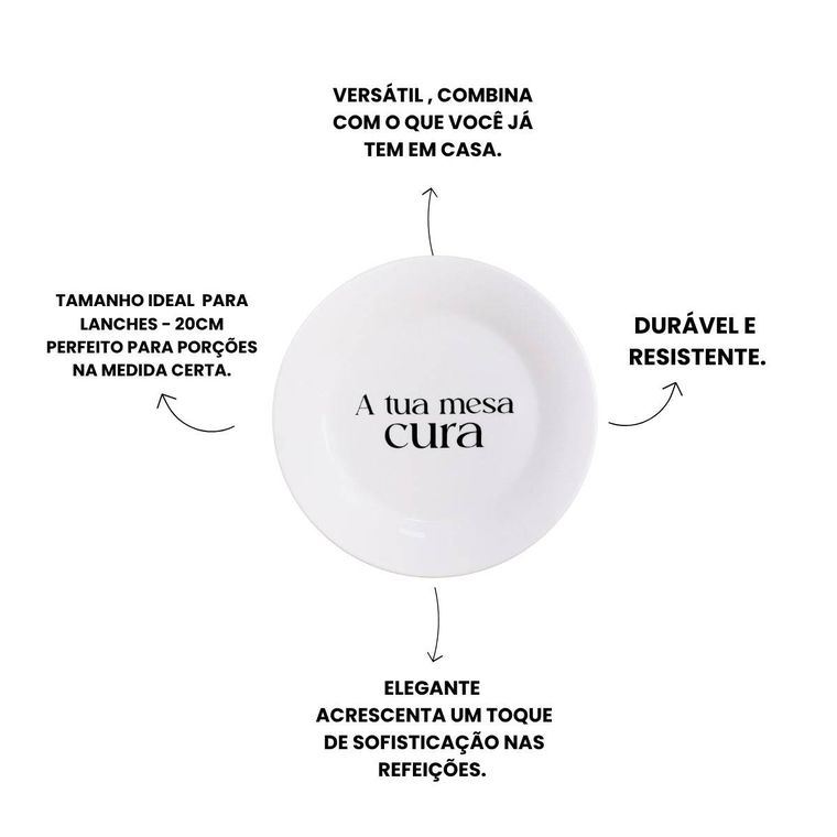 - Contém - 4 Pratos de Sobremesa Branco de Porcelana com a Frase "A tua mesa cura"