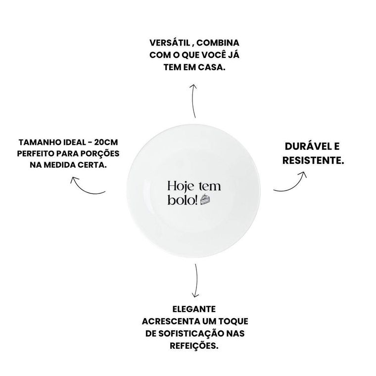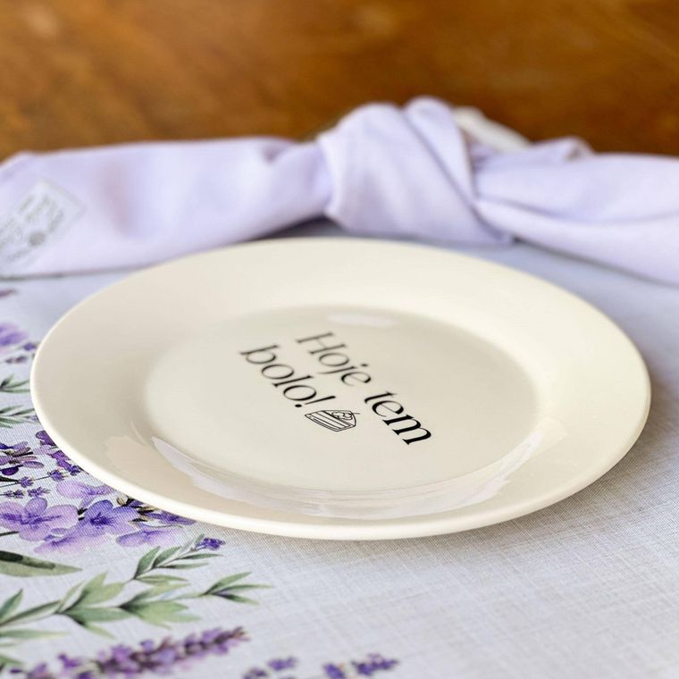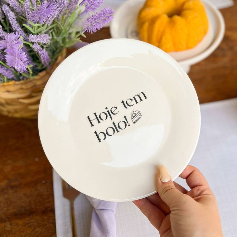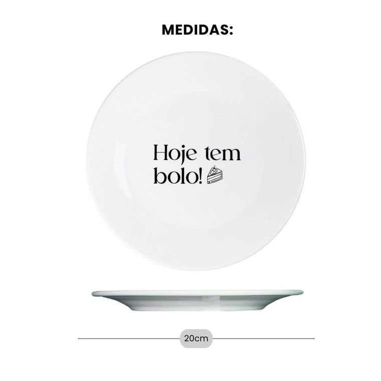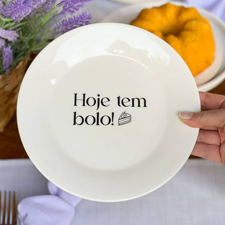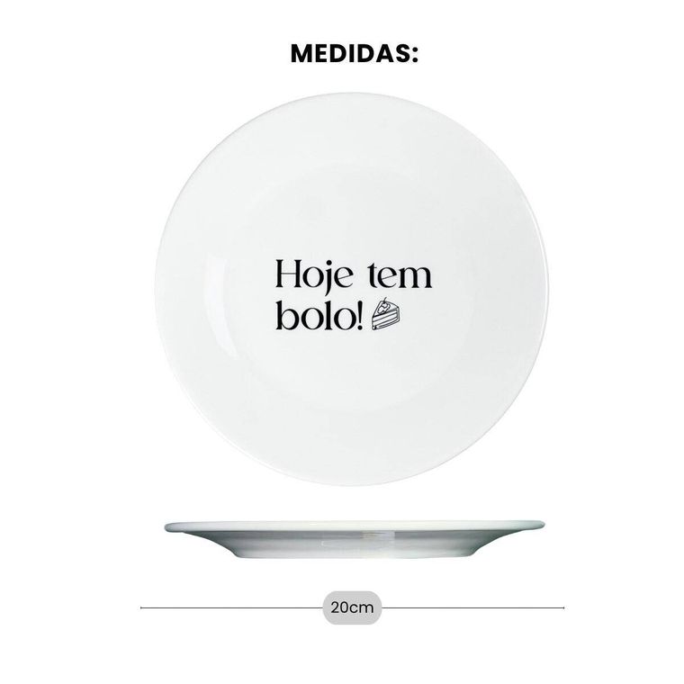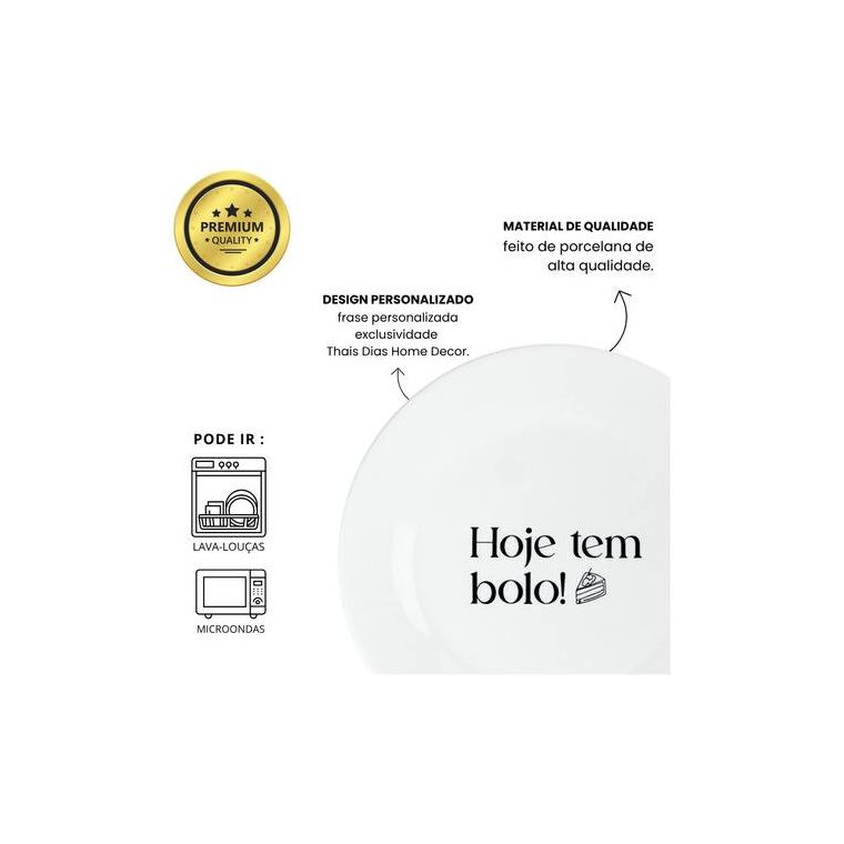 PRODUTO A PRONTA ENTREGA COM ENVIO IMEDIATO Kit 4 Pratos de Sobremesa Branco de Porcelana com a Frase "Hoje tem bolo!" O prato de sobremesa com a frase "Um dia de cada vez" é um dos nossos modelos de prato de sobremesa personalizado exclusivo Thais Dias Home Decor, que trazem um toque de carinho e criatividade na hora de estar a mesa! Além de serem lindos, são de ótima qualidade feitos de porcelana na cor branca eles são resistentes e seu design é versátil combinando com vários tipos de louças e ocasiões. Você vai se encantar com essa coleção. ESPECIFICAÇÕES DO PRODUTO - Material - Porcelana - Dimensões - Diâmetro 20,5cm - Cor - Branco - Contém - 4 Pratos de Sobremesa Branco de Porcelana com a Frase "Um dia de cada vez" CUIDADOS - Lave com detergente neutro e enxágue com água em abundância. - Para secar, utilize um pano seco e macio. - Evite o uso de produtos abrasivos. - Pode ir na lava louças. - Não levar ao forno. GARANTIA Em condições normais de uso, este produto tem garantia de 90 dias contra defeitos de material e fabricação, mediante apresentação da nota fiscal de compra. Má conservação, manuseio inadequado, quedas ou quaisquer outras avarias produzidas pelo uso incorreto, a garantia oferecida perde a validade IMAGENS MERAMENTE ILUSTRATIVAS