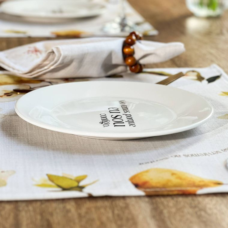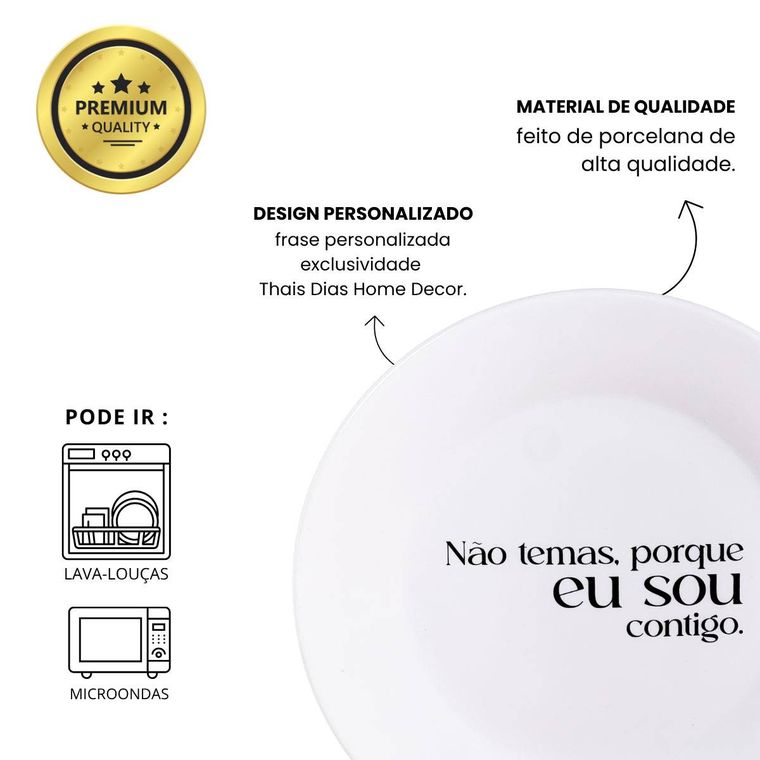 - Contém - 4 Pratos de Sobremesa Branco de Porcelana com a Frase "Não temas, porque eu sou contigo"