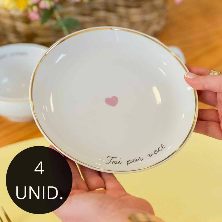 - Contém - 4 Pratos de Sobremesa Porcelana Filete de Ouro - Foi Por Amor