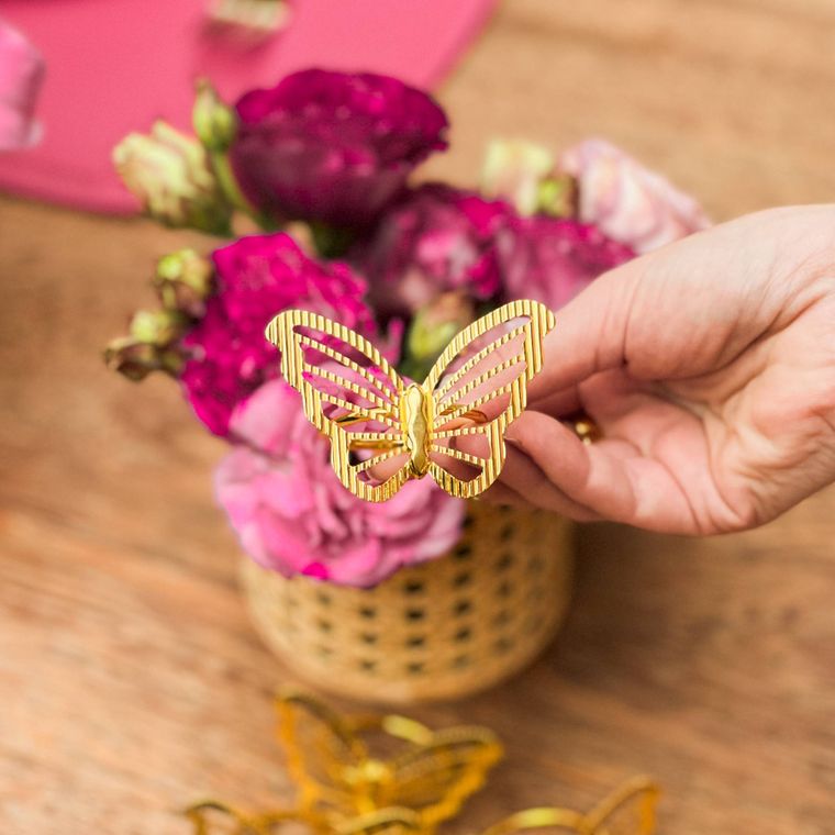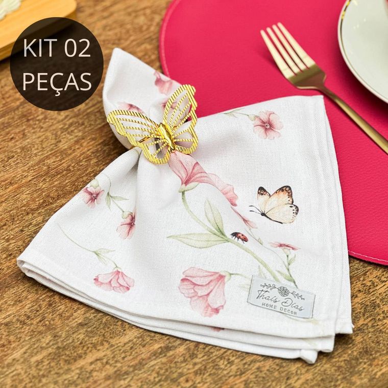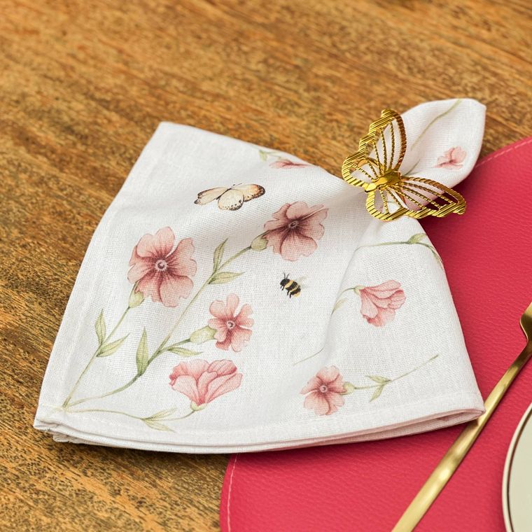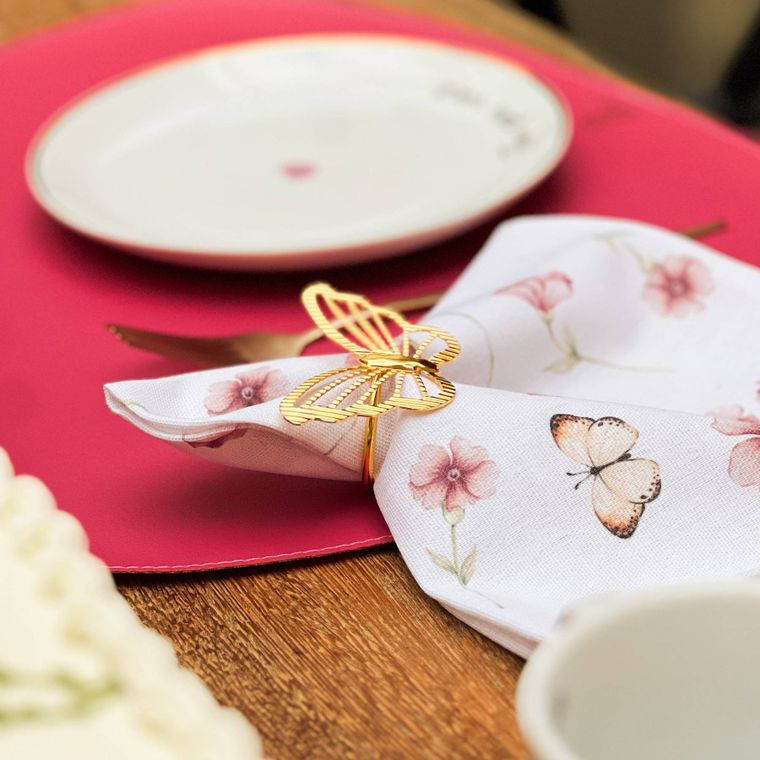 - Contém - 1 Guardanapo de Linho Jardim Regado e 1 Porta Guardanapo Borboleta Dourado de Metal - Jardim Regado
