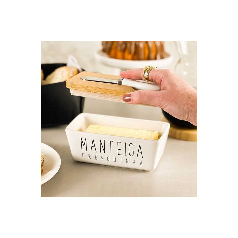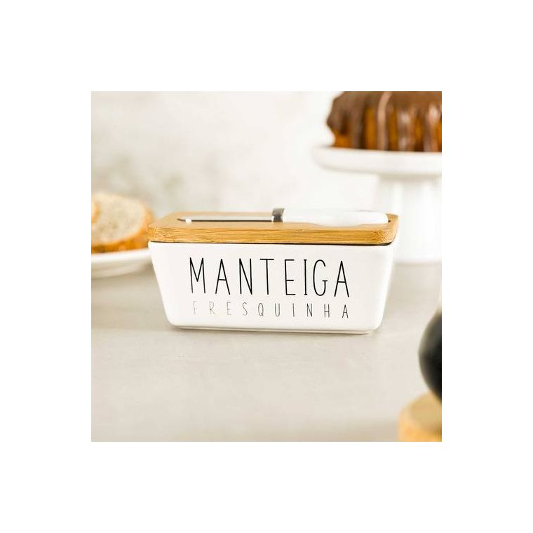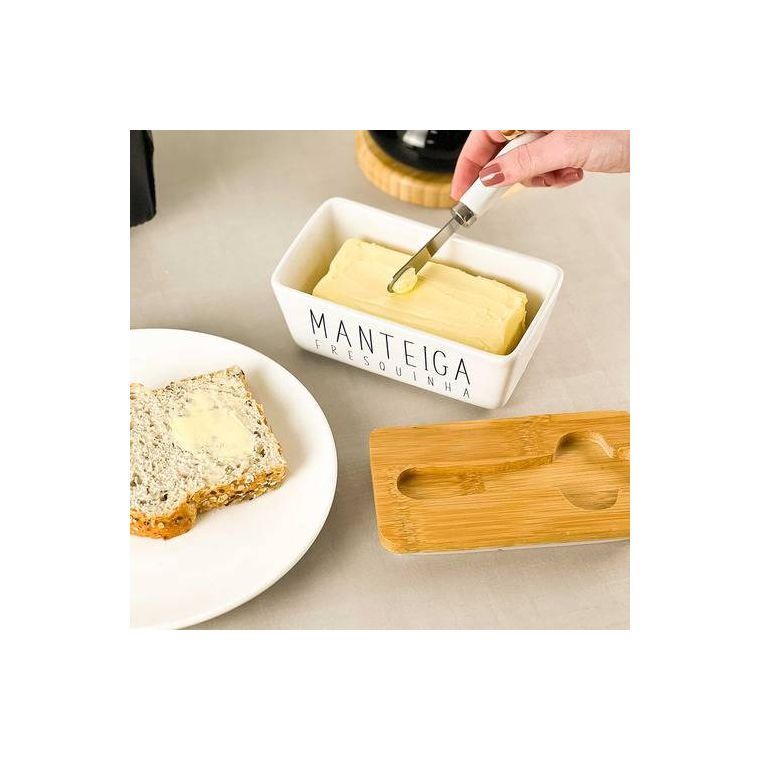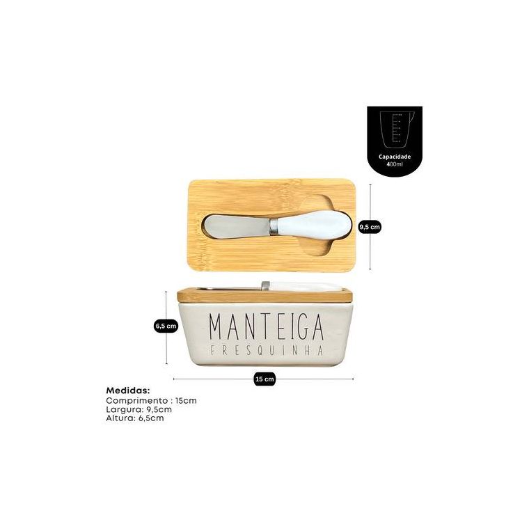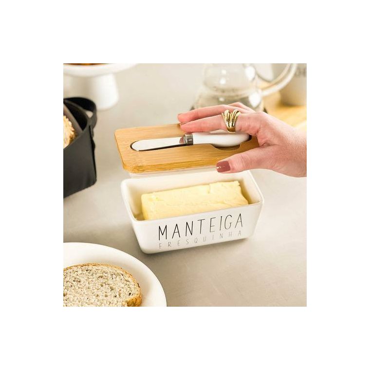 - Contém - 1 Manteigueira com tampa de bambu com estampa "Manteiga Fresquinha" e 1 Espátula de aço inox com cabo de porcelana