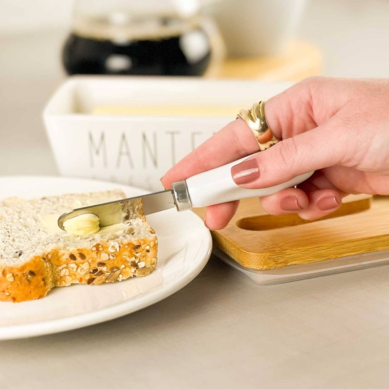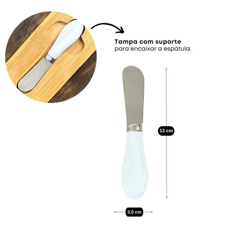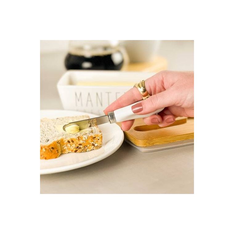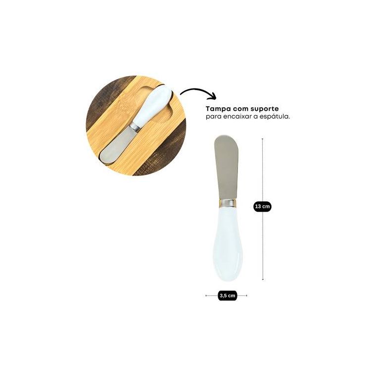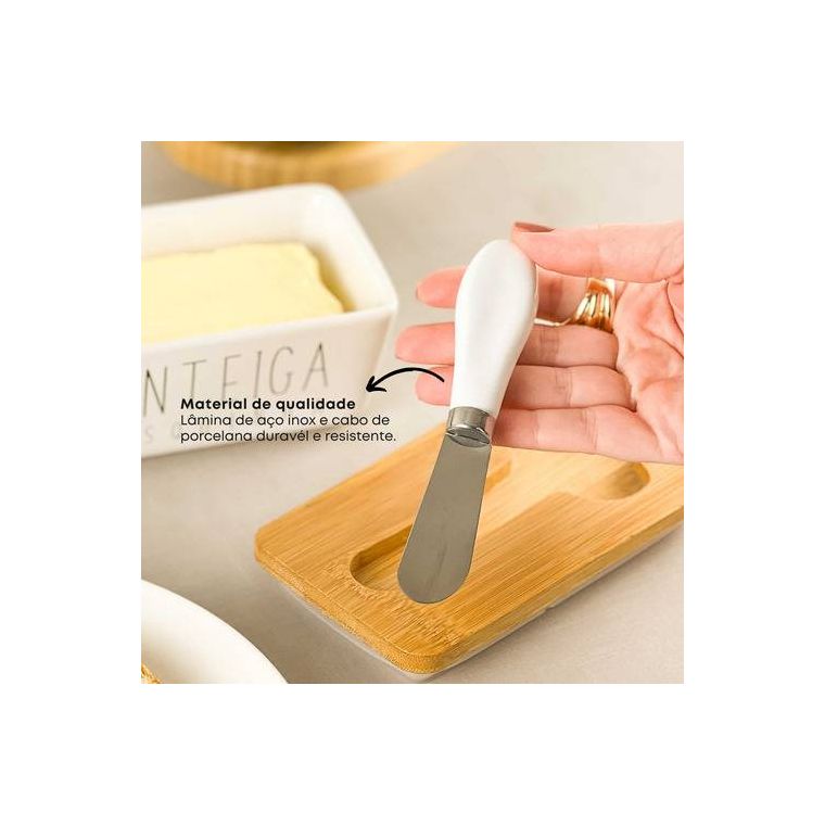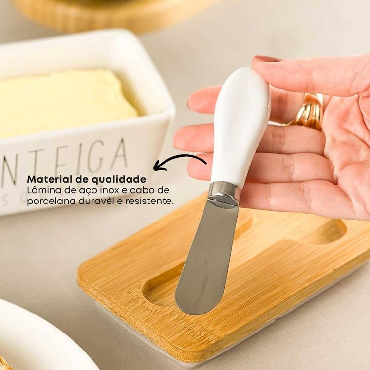 - Contém - 1 Manteigueira com tampa de bambu com estampa "Manteiga Fresquinha" e 1 Espátula de aço inox com cabo de porcelana