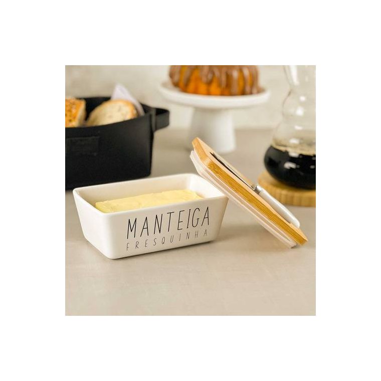 Feita de porcelana de alta qualidade, com tampa de bambu natural , que possui uma vedação de silicone que impede a entrada de ar e umidade, preservando o sabor, qualidade e a textura da manteiga por muito mais tempo