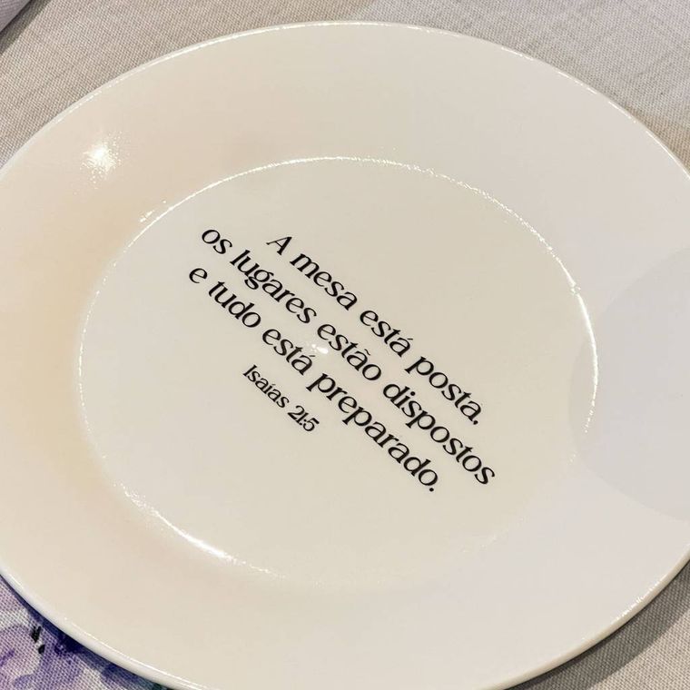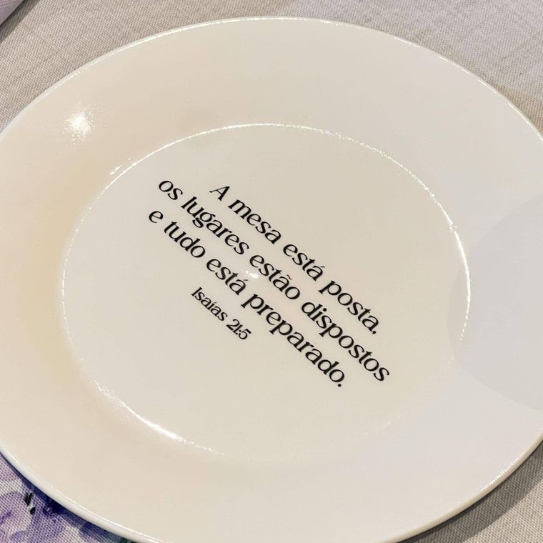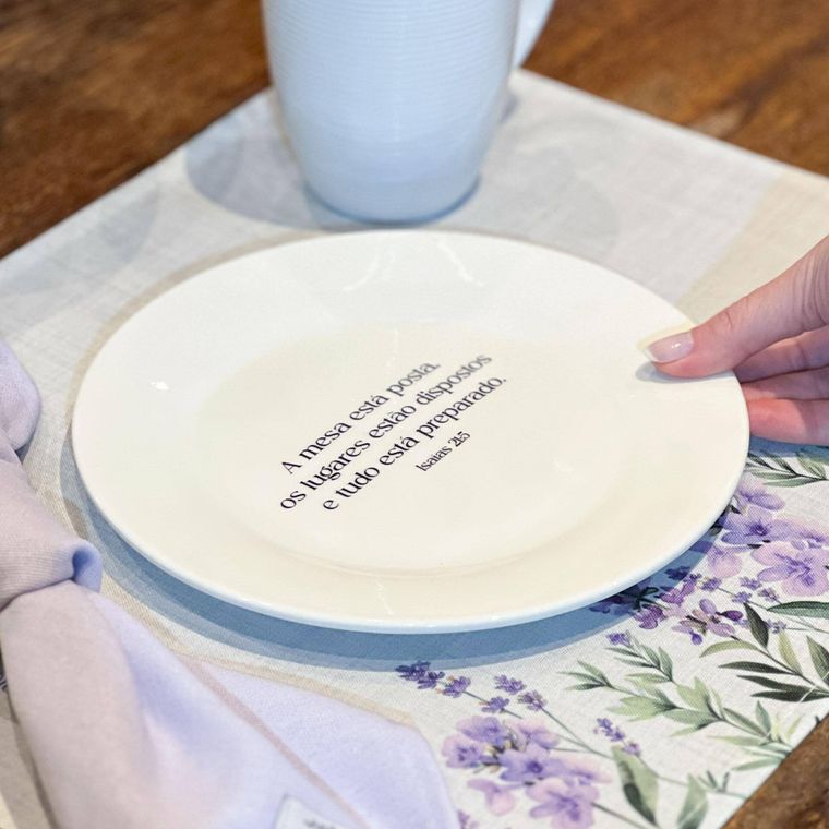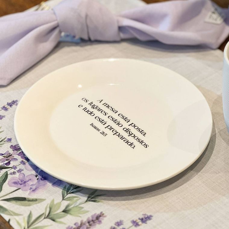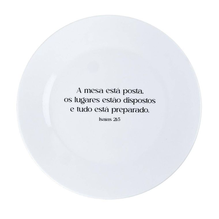 Prato de Sobremesa Branco de Porcelana com a Frase "A mesa está posta, os lugares estão dispostos e tudo está preparado. Isaías 21:5"