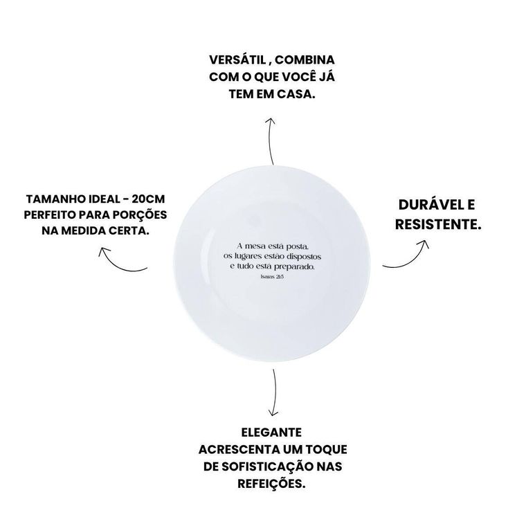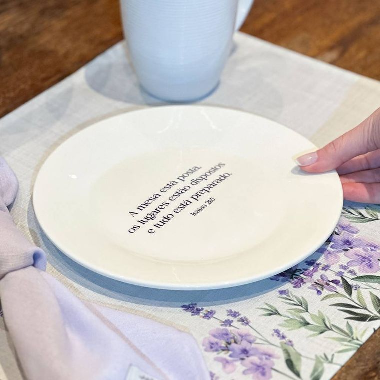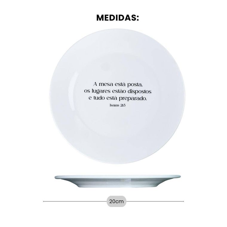 - Contém - 1 Prato de Sobremesa Branco de Porcelana com a Frase "A mesa está posta, os lugares estão dispostos e tudo está preparado. Isaías 21:5"