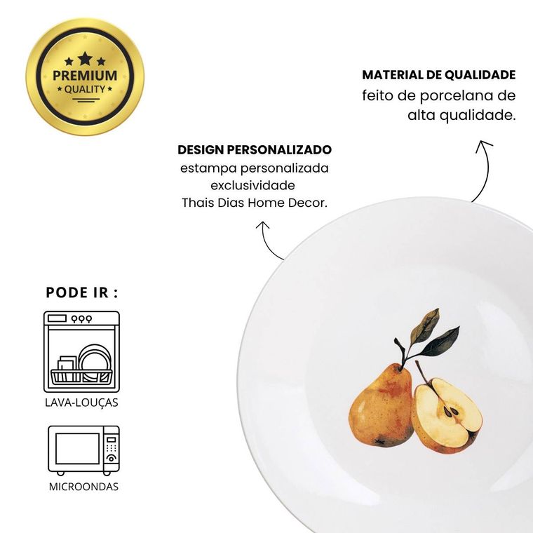 O prato de sobremesa peras é um dos nossos modelos de prato de sobremesa personalizado exclusivo Thais Dias Home Decor, que trazem um toque de criatividade e alegria na hora de estar a mesa! Além de serem lindos, são de ótima qualidade feitos de porcelana na cor branca eles são resistentes e seu design é versátil combinando com vários tipos de louças e ocasiões. Você vai se encantar com essa coleção.