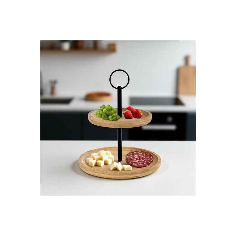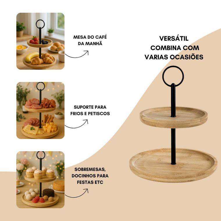 Conheça o Suporte para Doces com 2 Andares em Bambu e Metal, uma junção de beleza e praticidade. Com suas duas bases em bambu uma menor e uma maior, sustentado por uma elegante estrutura metálica que traz uma estética sofisticada e moderna, e o bambu, material conhecido por sua durabilidade e sustentabilidade, sendo um dos matérias mais procurados para artigos de cozinha e decoração, traz um charme natural, rústico e contemporâneo. Esse suporte é ideal para doces, frutas, salgadinhos, frios e até petiscos, otimizando espaço e agregando em qualquer decoração, evento ou refeição.