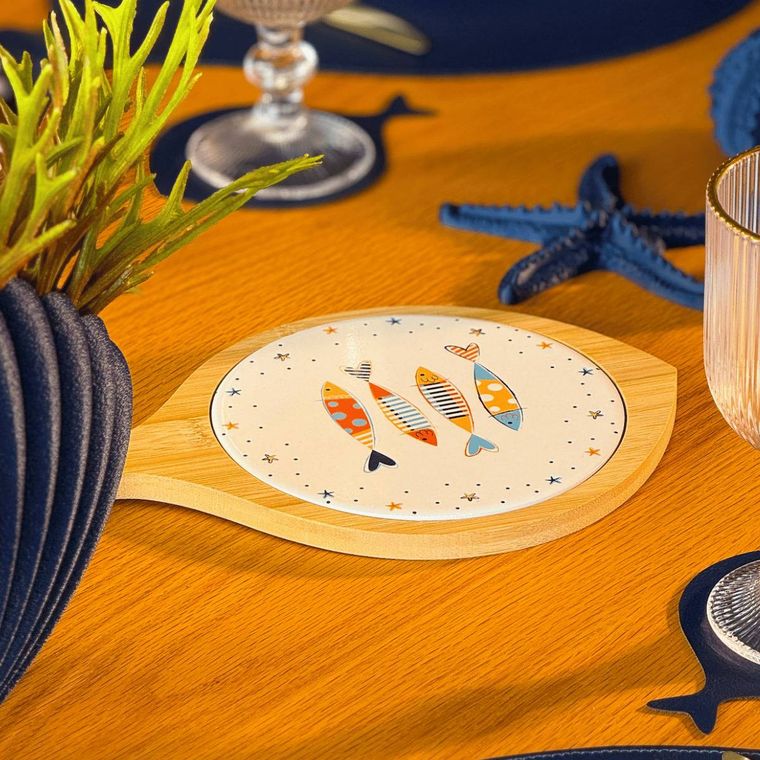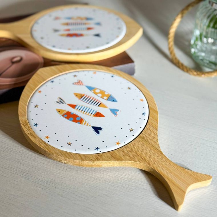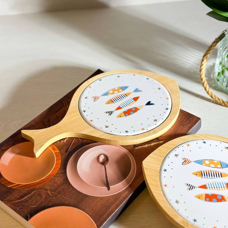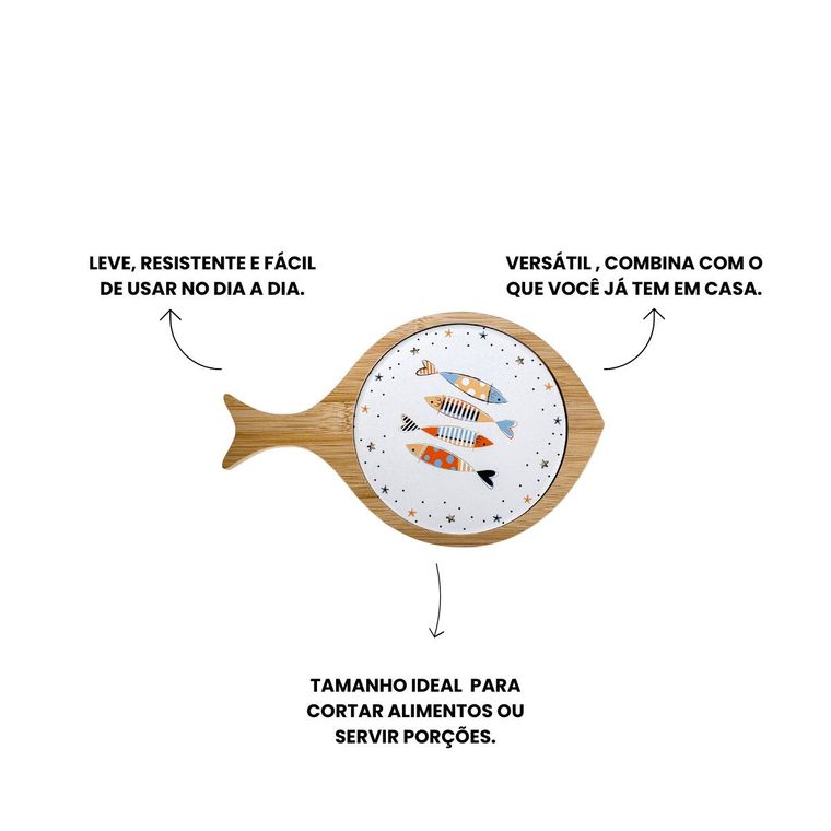 Traga charme e descontração para a sua mesa com esta linda tábua decorativa em formato de peixe. Produzida em bambu, ela conta com um centro em cerâmica estampado com peixes coloridos, criando um visual leve, moderno e cheio de personalidade. Perfeita para servir petiscos, queijos, pães ou simplesmente decorar sua mesa posta, ela combina praticidade com um toque lúdico e praiano. Uma peça versátil que transforma qualquer momento em uma experiência ainda mais especial.