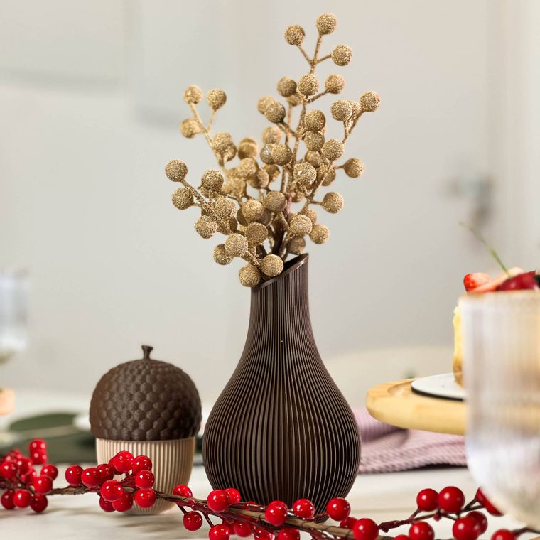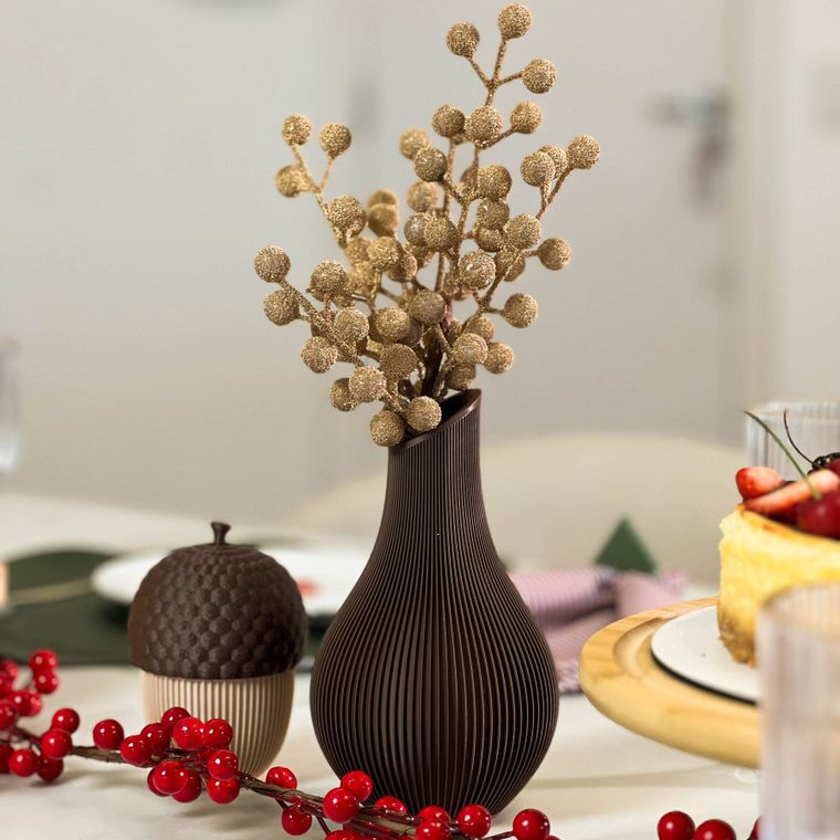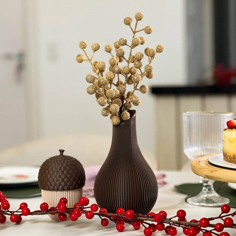 Com design moderno e acabamento texturizado, este vaso é a peça perfeita para quem busca estilo e sustentabilidade. Produzido em PLA, um material ecológico derivado de fontes renováveis, ele combina leveza, resistência e um visual sofisticado. Seu formato orgânico e a textura canelada em tom marrom fosco trazem um toque contemporâneo e natural à decoração, ideal para compor ambientes com elegância — seja com flores secas, artificiais ou como peça decorativa solo.